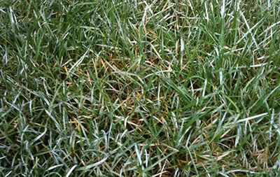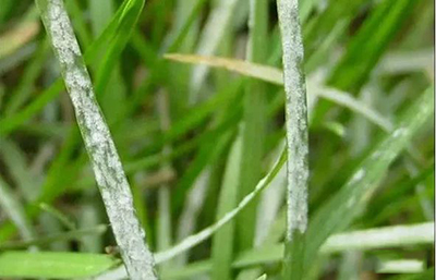 初白色,后污白色、灰褐色。霉層表面有白色粉狀物,后期霉層中出現(xiàn)黃色、橙色或褐色顆粒。隨病情發(fā)展,葉片變黃,早枯死亡,一般老葉較新葉發(fā)病嚴重。發(fā)病嚴重時,草坪呈灰白色,像撒了一層白粉,受震動會飄散,該病通常春秋季發(fā)生嚴重。