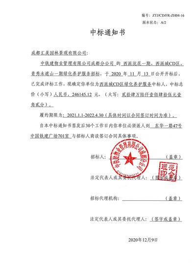 【喜報(bào)】-熱烈祝賀我公司中標(biāo)西派城CD區(qū)綠化養(yǎng)護(hù)服務(wù)!!
